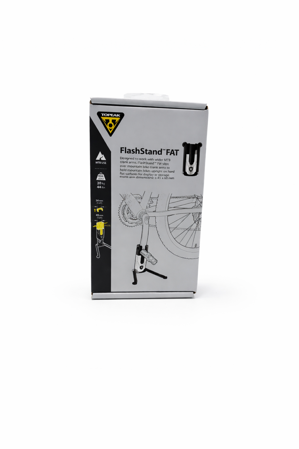 Kompatibel mit den meisten Mountainbikes. Praktischer Universal-Fahrradständer zur Aufnahme an der Kurbel (Nicht-Antriebsseite). Ausgelegt für Mountainbikes. Super kompakt lässt sich der FlashStand™ FAT zusammengefaltet in jedem Rucksack oder sogar in einer Trikottasche transportieren. Gefertigt aus Aluminium und FIberglas-Composite für erhöhte Robustheit und leichtes Gewicht.